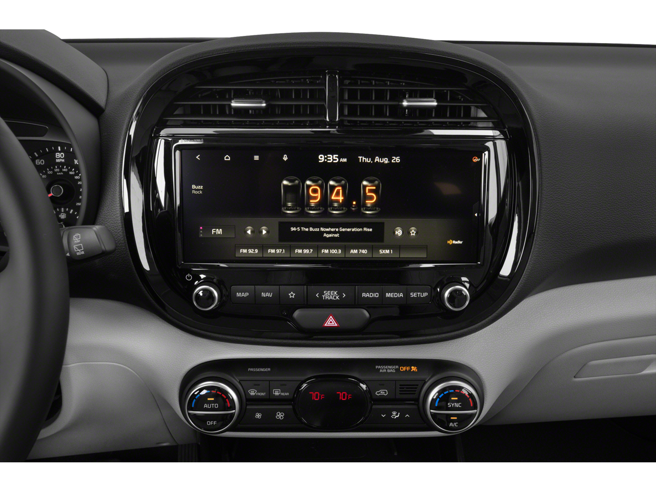 - Radio: AM/FM/MP3 Audio System -inc: UVO link, navigation, HD Radio, SiriusXM, 10.25" color touch screen, 6 speakers, support for Android Auto and Apple CarPlay, USB input, audio remote control, Bluetooth® hands-free w/voice recognition and black shark fine type antenna
